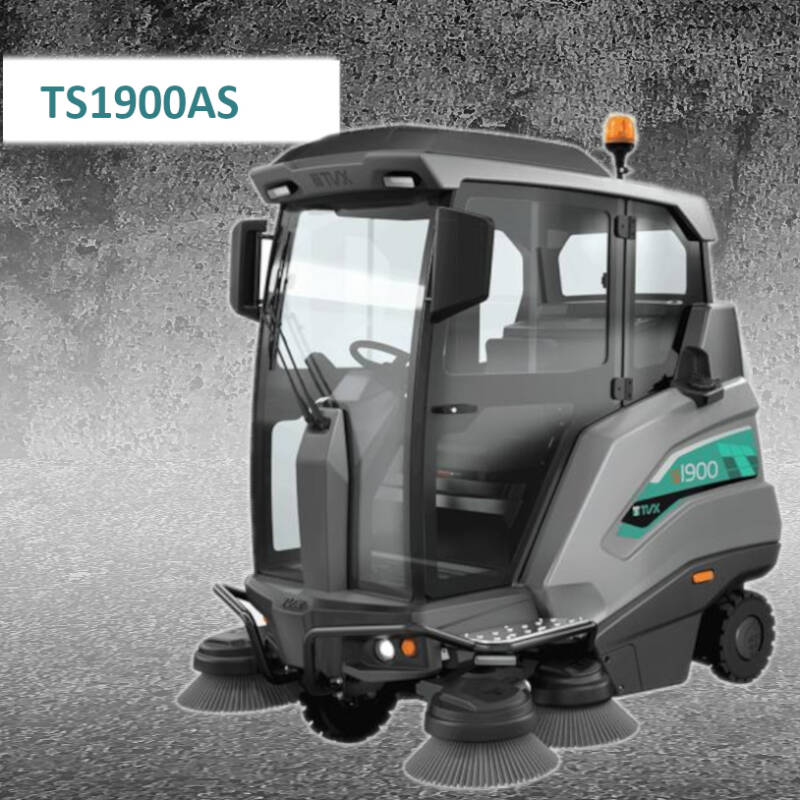 De gesloten industriële veegmachine TS1900AS is uitgerust met vier instelbare zijborstels en een regelbare hoofdborstel. De TS1900AS is uitgerust met een sproeisysteem dat het stof eerst vochtig maakt zodat er minder stofverstuiving is. De TS1900 AS komt met een wasbaar polyester filtersysteem van 20micron (10m²) en een automatische schudeenheid voor de filters. De krachtige tractiemotor zorgt ervoor dat de op het achterwiel aangedreven TS1900AS zich aanpast aan alle omstandigheden, zowel binnen als buiten.