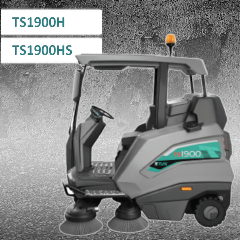 De half gesloten industriële veegmachine TS1900 is uitgerust met vier instelbare zijborstels en een regelbare hoofdborstel. De TS1900 is uitgerust met een sproeisysteem dat het stof eerst vochtig maakt zodat er minder stofverstuiving is. De TS1900 komt met een wasbaar polyester filtersysteem van 20micron (10m²) en een automatische schudeenheid voor de filters. De krachtige tractiemotor zorgt ervoor dat de op het achterwiel aangedreven TS1900 zich aanpast aan alle omstandigheden, zowel binnen als buiten. De TS1900H is uitgerust met een handmatige afvalbak, de TS1900HS is uitgerust met en automatische afvalbak.